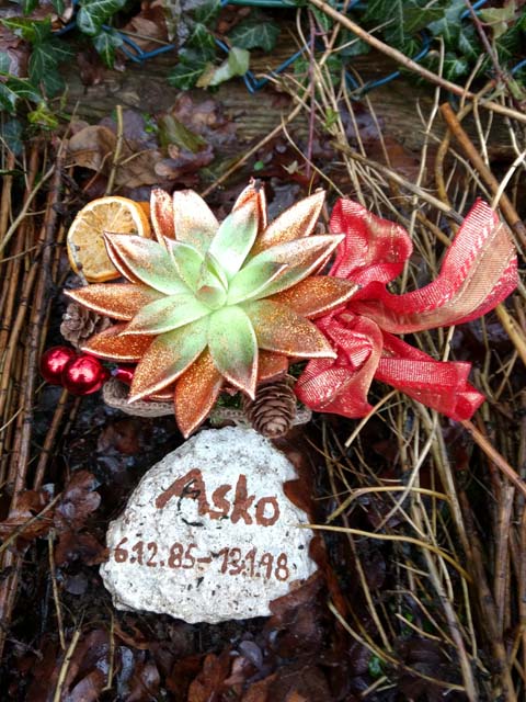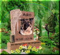 "ich muss sagen, es war sehr feierlich und wie eine wirkliche Beerdigung. Ich habe wirklich noch einmal Abschied nehmen können, Asko war so gegenwärtig, als ich noch einmal sein Haar gestreichelt habe, seine Zähne betrachtet und mich fast an seiner Kralle geritzt hätte. Anschließend hatte ich sogar Asko-Haar auf meiner Hose, denn ich hatte von Asko ja noch Haare, Zähne, Krallen und andere Sachen zu Hause, und es war jetzt einfach die Zeit, auch diese gehen zu lassen. Ich habe jetzt ein Teil von Asko im Garten und das ist gut so, er hat eine schöne Gedenkstätte bekommen und ein Bild sowie sein Spielzeug (was ich noch hatte) sind auf einem Kreuz, sein Lieblingsball ist auch letztes Jahr kaputt gegangen und so wurde der kurzerhand mitbeerdigt: